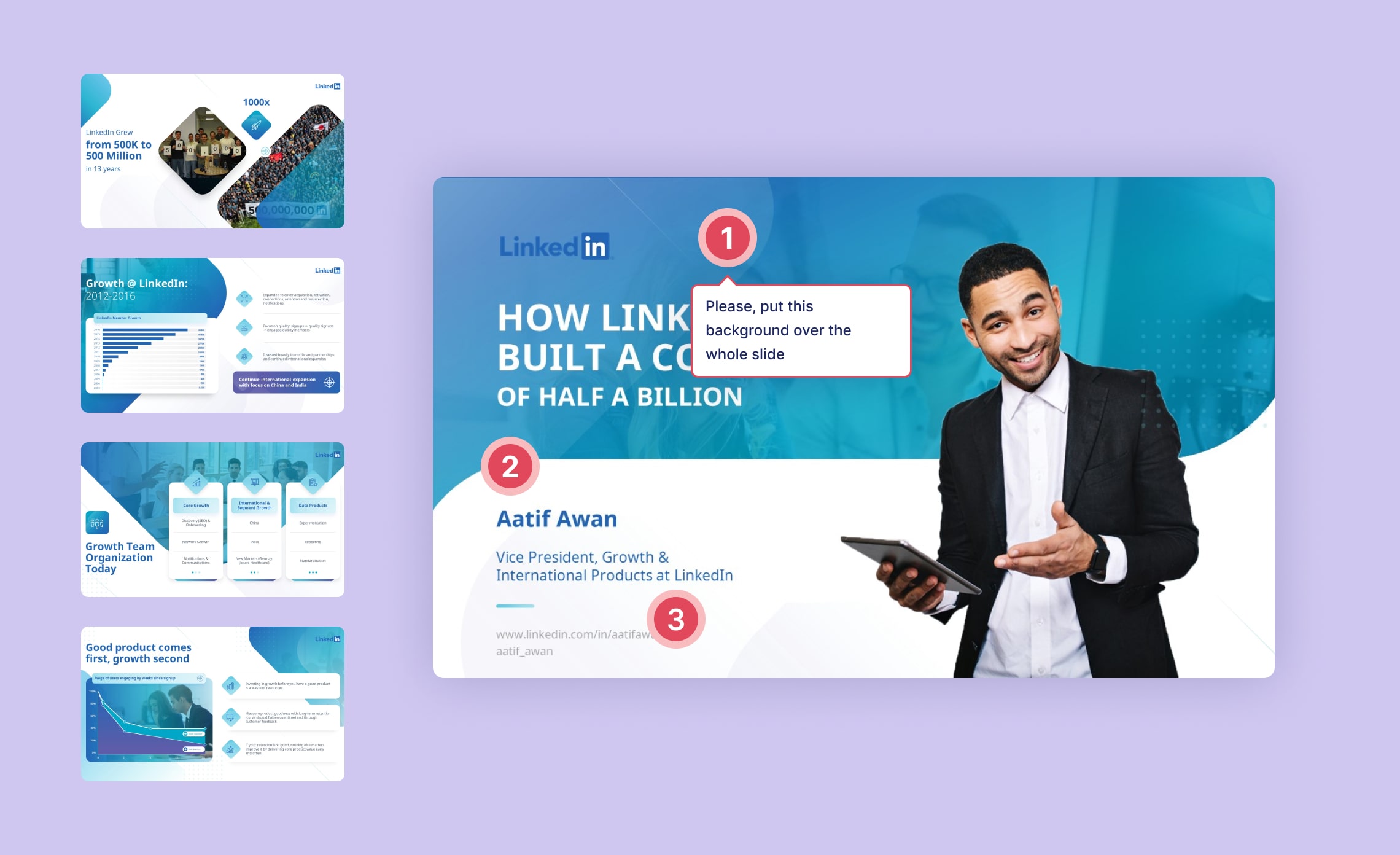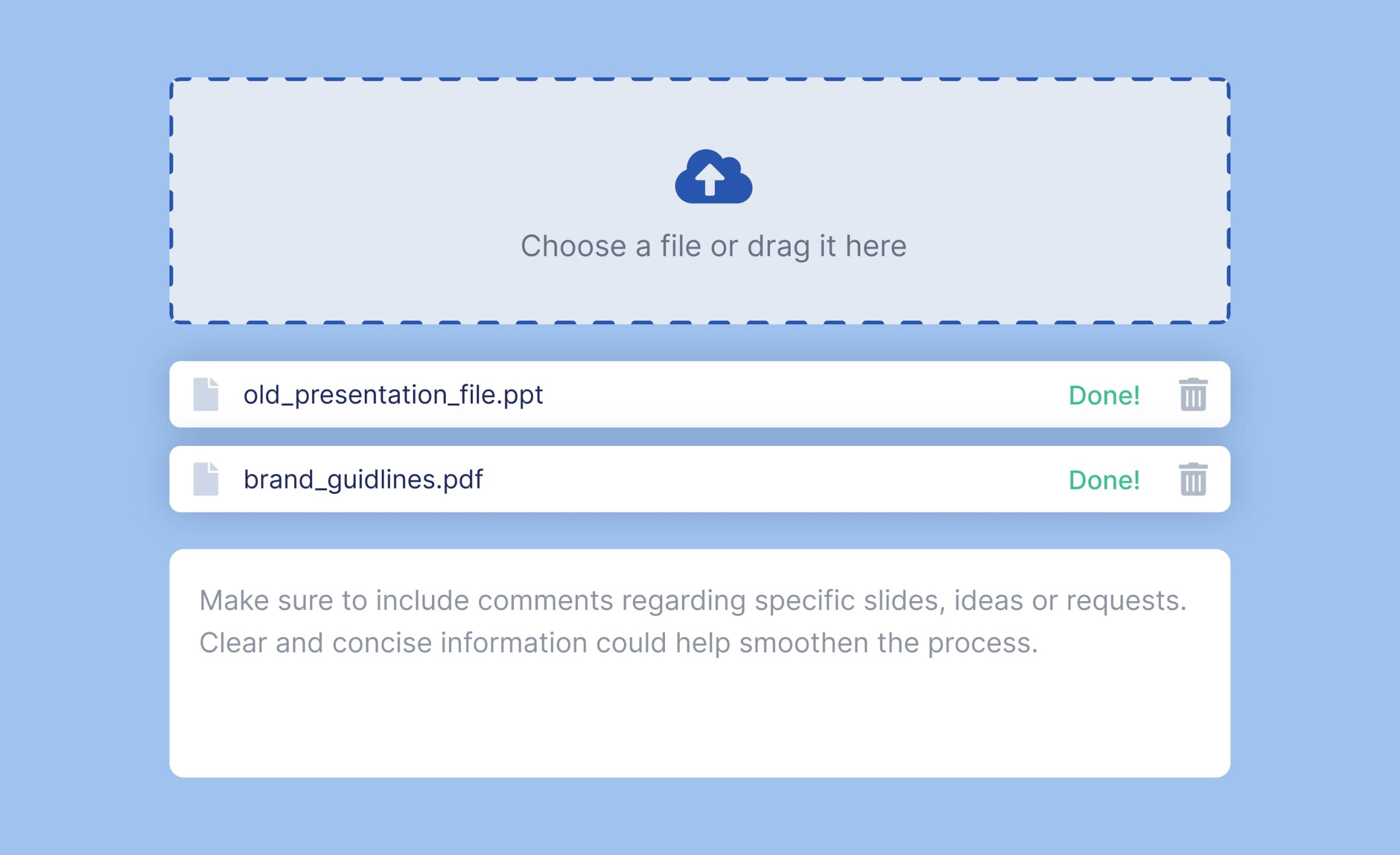 And right from our platform, you’ll be able to revise each slide by selecting specific areas and adding comments to them. All these revisions are free and handled in a matter of hours by our team.